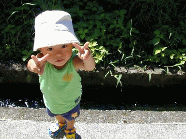 溝の水の流れがちょっと早いので、 きみぴよは怖がってまだ飛び越せない。 最初は、向こう側に行くのを嫌がったが、最近は行きたがる。 草をちぎって、水に流して「はっぱのおふね」と言って喜んでいる。 |