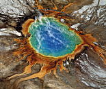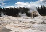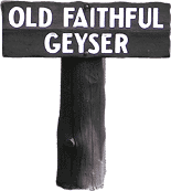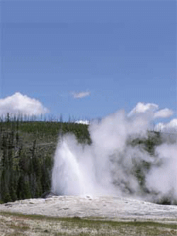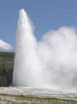 イエローストーンのシンボルになっている有名な間欠泉。 65〜90分おきに約4万リットルの熱水を約40〜60mの高さに噴き上げる。 「Faithful」という名前のとおり、120年間ほとんど一定の噴出時間、間隔、高さを保っている。 噴出時刻近くになると大勢の観光客がオールドフェイスフルガイザーの前に集まってくる。 噴出は約4分間続き、夜はライトアップされる。 |