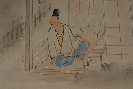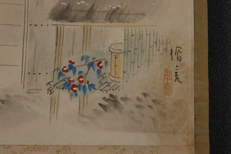 塗りの軸鼻 管真人箱書の軸です。 夕闇の迫る頃なのか燭台が点されています。 傍らの閼伽棚には椿が置かれています。 鴨長明でしょうか、男が一人描かれています。 春が待たれていますね。 縦 118cm 巾 44.5cm 軸サイズ 縦 34.5cm 巾 41.5cm 本紙サイズ ¥19,800