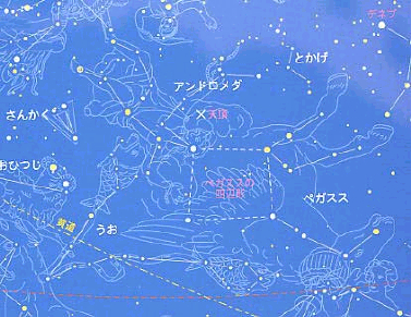まわりに目立つ星もなく四角形の星の並びが直ぐにそれと分かります。ペガスス座は形が雄大なほかはさしたる話題はありませんが、四角形の中は極端に星が少なく、まるで天を切り抜いたように真っ暗に見えるため、日本では「ます形星」等とも呼ばれています。