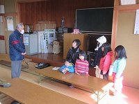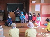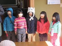 ■ 「いこま山のようちえん」が卒園の挨拶 (3月10日) “たなださんありがとう・・・” 3月で卒園する「いこま山のようちえん」の園児6名から卒園の挨拶がありました。当クラブからもお返しに竹カエルのストラップをプレゼント。毎月2回(第2・4月曜日)棚田を訪れる「いこま山のようちえん」。棚田の自然の中で自由に遊びを見つけてすくすく成長していく園児たち。元気な園児達に触れ合い私達も元気をもらっています。 |