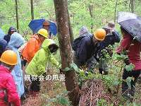 | ■ クラブ内で向山の観察会を行いました 週一回の活動日はいつも作業に追われている当クラブですが、“お楽しみタイム”も必要とのことで、4月28日の午後、小雨模様でしたが全員で新緑の里山(向山)をトレッキングしながら観察会を行いました。地元西畑町自治会の代表も特別参加されました。約1時間程の行程で多くの希少な草木が観察されましたが、エビネランの群落にはちょっと感激しました。 |