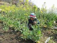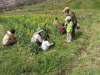 | ■ 菜の花が開花・・・ならっぴチーム西畑活動(第5回目) 4月6日(日)の雨上がりの棚田、ソメイヨシノはほぼ満開ですが菜の花はまだ二三部咲き。昨年は同時開花でしたが今年は菜の花の開花が少し遅れました。見ごろは1~2週間後になりそうです。ならっぴチーム西畑メンバーの皆さんは草抜き作業とともに、畑の中のウオーキング、菜の花摘み、記念撮影など・・・菜の花畑の中で楽しいひと時を過ごしました。 |