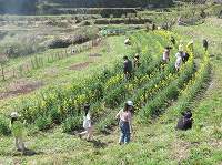 | ■ ヤグルマギクの植付け作業を行いました 昨年のコスモス畑の跡地にヤグルマギク(通称:矢車草)の植付けを行いました。“休耕田をお花畑に・・・”との思いで数年前から始めた取組みです。2月のまだ寒い時期ですが、お花畑で育てた若い苗を農道沿いの休耕田に移植しました。5月にはきれいに開花し棚田に彩りを加えてくれるでしょう。 |