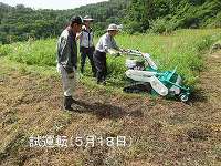| ■ 「自走式草刈り機」が新規導入されました 地元西畑町自治会が今回新たに「自走式草刈り機」を導入。当クラブの草刈り作業にも使用させていただけるとのことで、25日(月)に説明会が行われました。自治会責任者から操作方法の説明と運転体験・・・、運転に慣れるには少し時間が掛かりそうです。現在の草刈り作業は「刈り払い機」による手刈りが中心ですが「自走式草刈り機」を活用できればかなり作業効率が上がりそうです。今年の草刈り作業はほぼ終わりましたので「自走式草刈り機」が活躍するのは来春以降の草刈りシーズンになります。 |