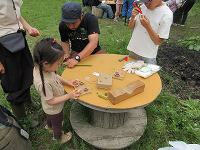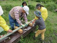 | ■ 「ならっぴクラブチーム西畑」が‘竹工作遊び’(5月18日) 5月18日(日)ならっぴクラブチーム西畑の第6回目の活動が行われました。午前中は菜の花畑の最終の草取り、午後は竹工作遊びで楽しんでいただきました。竹工作遊びでは‘竹コップ’と‘竹カエル’作りに取り組んでいただきました。鋸を使った竹切り作業はちょっと大変でしたが、ちびっ子達も頑張りました。 |