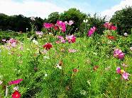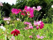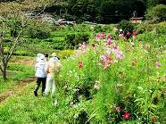 | ■ 棚田コスモス畑が満開 秋の代表的な花といえばコスモス、農道沿いのコスモスが咲き誇っています。赤、白、ピンク、黄色・・・・色も多彩で棚田に彩りを添えています。‘花畑グループ’が取り組んでいる「休耕田のお花畑」、春はヤグルマギクを育てましたが、その跡地には昨年のコスモスが自生し、あまり手間をかけずに背丈ほどに育ち開花してくれました。 |