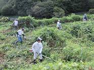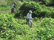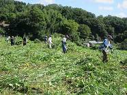 | ■ 地元の皆さんとの「共同草刈り」 9月21日(日)、恒例の地元の皆さんとの「共同草刈り」が行われました。日頃手の届かない場所の草刈り作業です。今回は「旧そば畑休耕田」「自治会館前道路法面」を中心に実施されました。これ迄草刈りのできていない休耕田は、雑草が背丈以上に伸びておりタフな作業を強いられました。 |