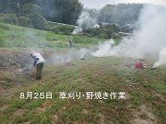 | 猛暑の最中ですが菜の花畑の準備作業が始まりました。10月には‘ならっぴクラブ西畑’による「菜の花の種蒔きイベント」が予定されています。菜の花は連作障害を避けるため毎年栽培場所を代えていますが、今年はこれまで田んぼをしていた跡地を菜の花畑に転用することになり、8月4日、草刈り・野焼き・耕運作業が行われました。9月には施肥・畝立てなどの準備作業が控えています。 | |||||||||||||