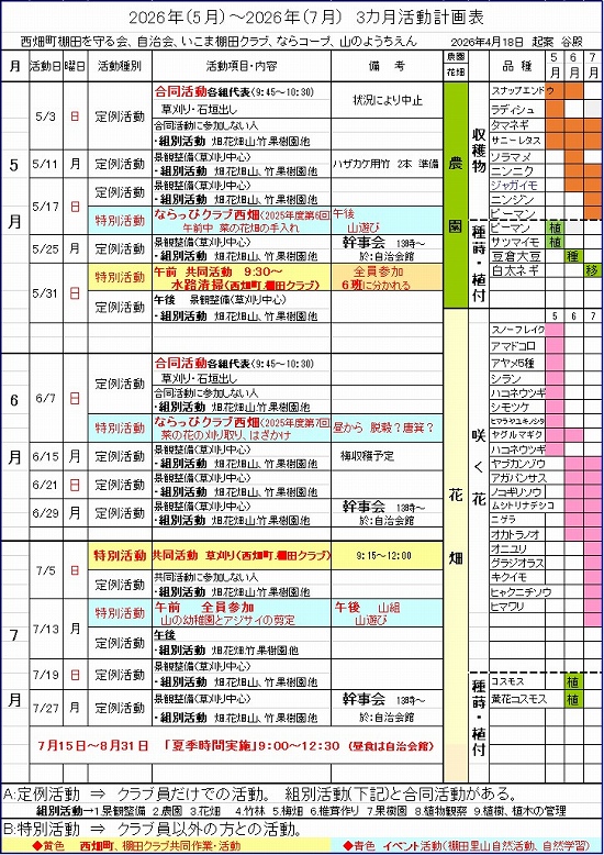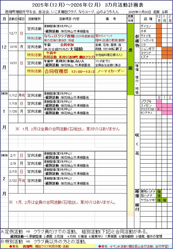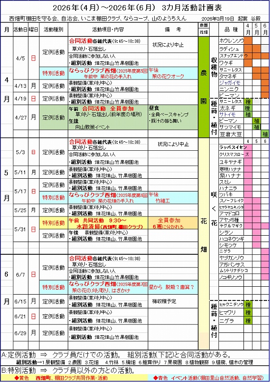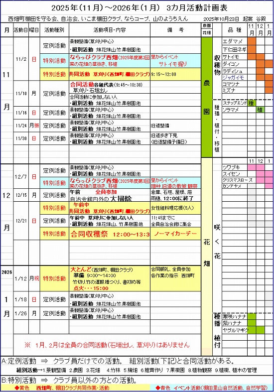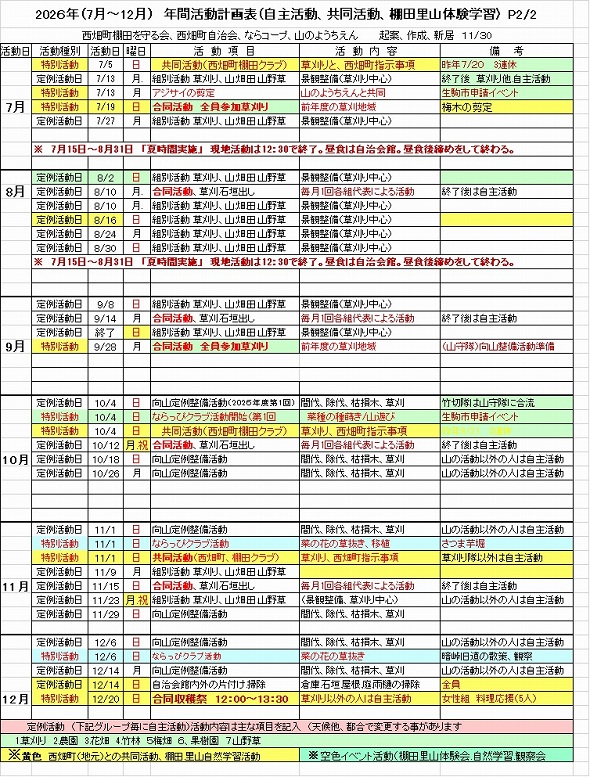 年間計画     :今年度予定されている定例作業、諸行事及び地元との共同作業の年間計画