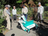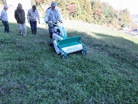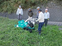 | これまでの草刈り作業は「刈り払い機」による手刈りが中心ですが、地元西畑町自治会が新たに「自走式草刈り機」を導入。当クラブの草刈り作業にも使用を開始。 |