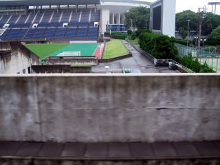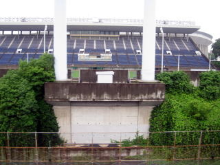 ●はい、鶴ケ丘です。ここの看板も「キンチョウスタジアム」に変わるのでしょうか。 ●実は鶴ケ丘の駅で降りる前に、JR長居駅へ乗り越しました。その電車内から見えるスタジアム。