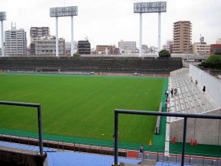 ●最後はピッチから、バックスタンドを臨む。見にくいのですが、後ろにJRが走っています。スタンドと同じ高さかなぁ。