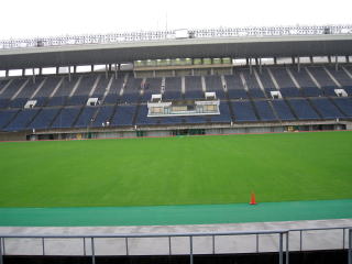 ●ちなみにLED掲示板のうしろにプロカメラマンが陣取るとのこと。●メインスタンドに登って写真を撮りました。見えるかなぁ、ピッチの上の白いポッチリがコーナー。そのラインの後にゴールがあるわけですから、その近さが分かるでしょう。