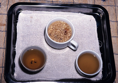 真ん中のお茶はよくわからない物が入っていたので店の人に中身を書いてもらったのが、これ。