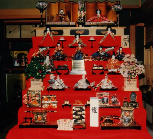 Hinamatsuri is a doll festival. It is celebrated by families with daughters on March 3. They display gorgeous dolls on a stepped shelf to express the wish for their daughters' good health and growth. The dolls represent people who lived in the Heian court. There is an empress and an emperor on the top shelf. Three ladies of the court are on the second. Five court musicians are on the third. Two escorts are on the fourth. Three guards are on the fifth. On the sixth and seventh shelves there are many things which represent what an empress brings to the court when she marries an emperor. Diamond-shaped rice cakes, sweets and white Japanese rice wine are also displayed and eaten on that day. These dolls are gifted to a girl by her mother's parents.