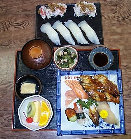 shrimp, octopus, eel, sea bream, crab, salmon,