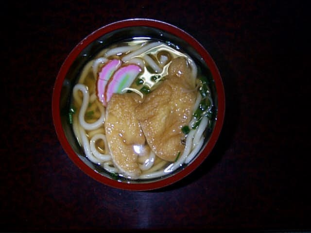 | This is called noodles with fried tofu. We need a fried tofu, fish paste, some boiled noodles and a little chopped up green onion. First we boil the fried tofu with sugar and soy sauce. Cut the fish paste into thin slices. We make a broth with soy sauce, salt, fish stock, sugar and a sweet kind of Japanese rice wine. Just before serving, reheat noodles quickly by dipping in boiling water and put them in the bowl. Put fish paste, simmered fried tofu and chopped up green onion over the noodles and pour broth over them. When we eat noodles, it's OK to slurp! |