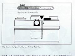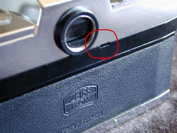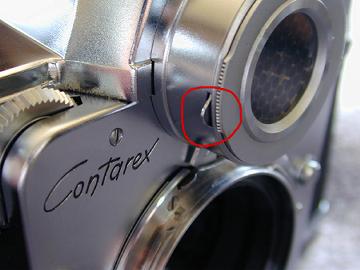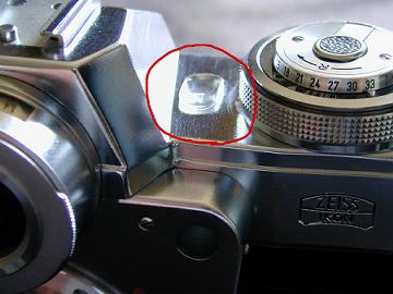 ファインダ内露出計指標の明かりとり窓にカマボコ型のプラスチック蓋 露出計のハニカムカバー取り外しレバー データテープ挿入のためのスリット 「CONTAFLEX CONTAREX」Hans-Jurgen Kuc(a)p.107より