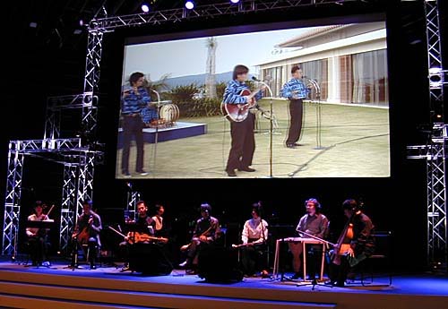 編成は 弦5、管2、ピアノ。プログラムはオリジナルを入れたかったがNHK側の希望によりヴィヴァルディ、ベートーヴェンなどの編曲ものと「千と千尋の神隠し」などのポップス系となった。ソフト的には必ずしも楽団の実力を引き出す選曲とは言いがたいが、殆んどの参加者が知っている音楽を演奏する、というのもイベントでは仕方がない。後ろの画面に投影されているのは、この後、回線を利用してコラボレーションする沖縄の若手アーティスト達。