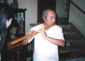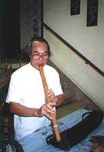 演奏中の笛は尺八型の縦笛。