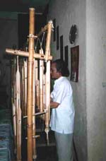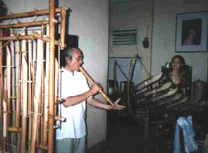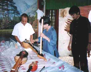 専門は竹製の打楽器と管楽器で、ナイフ一本で全ての楽器を作る。奥様も打楽器奏者としてアンサンブルの一員を勤め、世界を回られている。