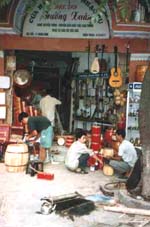 ベトナムの楽器店は家内制手工業で、工房と一体化した店の前で何人かの職人が分業して楽器をせっせと作っている。
