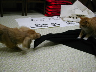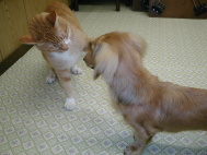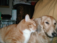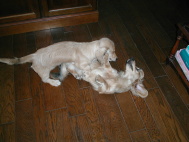 | 猫パンチにもめげず 兄貴にくっ付いて 遊んで貰おうと 追っ かけては 嫌われて いましたが 今では ヤンも楽しんでいる ようです。 |