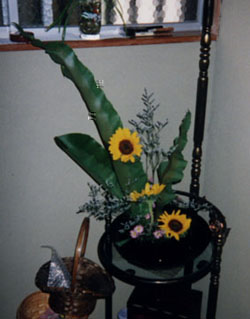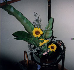 花材:谷渡り、ひまわり、くじゃく草、ブルーファンタジー