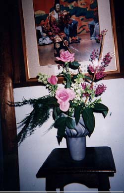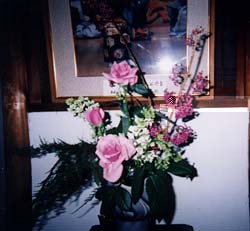 花材:小紫式部、バラ、アスパラの葉、(もう一つは聞くのを忘れました)