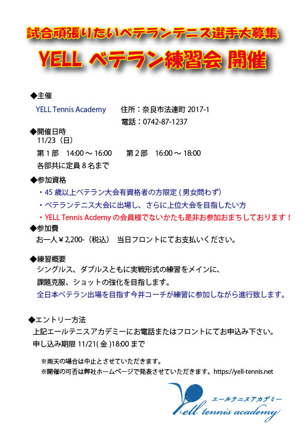 11月23日(日)14:00〜エールテニスアカデミーにて